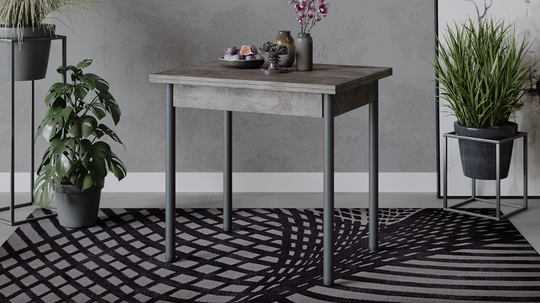 Стол имеет поворотно-раскладной механизм трансформации. Длина стола увеличивается вдвое: для этого нужно развернуть столешницу на 90 градусов и опустить верхнее крыло.