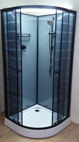- Комплектация: поддон 15 см с бортиком, черный профиль, черные дуги, черный ручной душ на стойке с держателем и гибким шлангом, черная стеклянная полка, черный смеситель, ролики, ручки, магнит на двери;