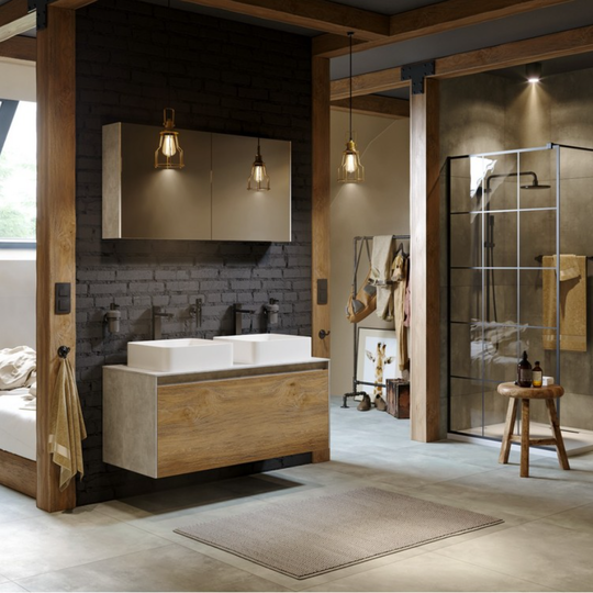 Тумба Mobi 120 оснащена двумя ящиками: основным и внутренним, скрытым за фасадом. Направляющие ящиков обеспечивают плавное и мягкое закрывание. Внутренний ящик тумб укомплектован пластиковым разделителем для хранения различных мелочей. Внутренняя отделка ящиков комбинированная: боковины – цвет бетон светлый, дно – дуб балтийский. В комплект тумбы Mobi входит специальный сифон, позволяющий экономить пространство мебели. Фасады, боковины и столешницы из МДФ толщиной всего 10 мм. Подходит любой наставной умывальник. При этом умывальник может устанавливаться в любом месте, а не только центру. На данную тумбу также можно установить один умывальник. Коллекция оснащена итальянскими навесами Camar, которые выдерживают нагрузку до 200 кг.