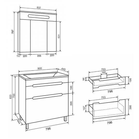 Тумба Olivia 80 оснащена двумя выдвижными ящиками на шариковых направляющих скрытого монтажа с доводчиками. Ящики легко открываются благодаря удобным вырезам на фасаде.