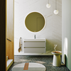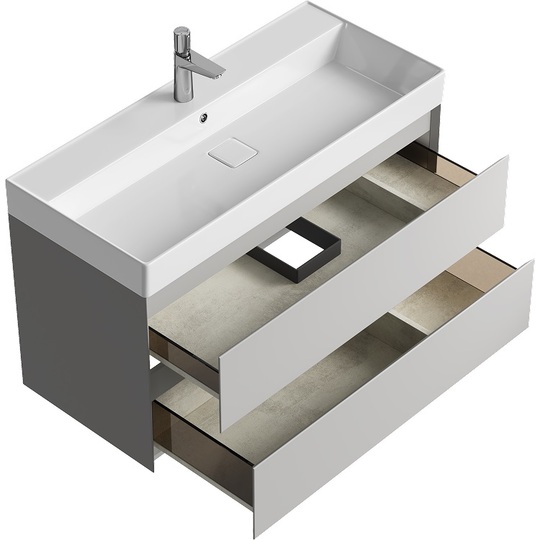 Тумба Aqwella Geometria 100 оснащена двумя выдвижными ящиками на направляющих скрытого монтажа, что обеспечивает плавное скольжение и мягкое закрывание. Фасады и боковины с обработкой торцов под углом 45 градусов создают лаконичность и изящный, почти монолитный силуэт в закрытом состоянии. Все грани имеют округлую фрезеровку, обеспечивая приятные тактильные ощущения при открывании. Внутри ящиков - отделка под светлый камень, боковины выполнены из толстого тонированного стекла, что добавляет коллекции элегантности.