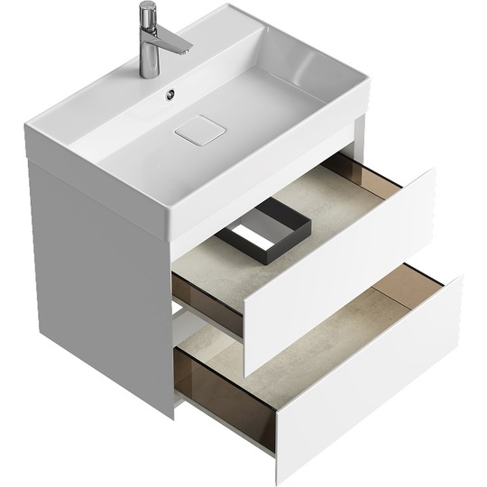 Тумба Aqwella Geometria 65 оснащена двумя выдвижными ящиками на направляющих скрытого монтажа, что обеспечивает плавное скольжение и мягкое закрывание. Фасады и боковины с обработкой торцов под углом 45 градусов создают лаконичность и изящный, почти монолитный силуэт в закрытом состоянии. Все грани имеют округлую фрезеровку, обеспечивая приятные тактильные ощущения при открывании. Внутри ящиков - отделка под светлый камень, боковины выполнены из толстого тонированного стекла, что добавляет коллекции элегантности.