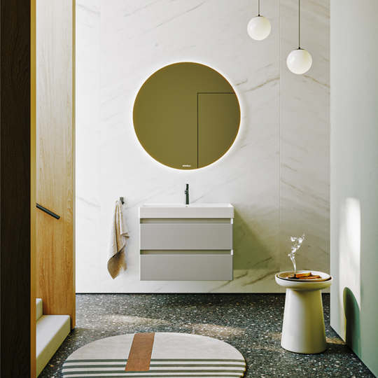 Тумба Aqwella Geometria 80 оснащена двумя выдвижными ящиками на направляющих скрытого монтажа, что обеспечивает плавное скольжение и мягкое закрывание. Фасады и боковины с обработкой торцов под углом 45 градусов создают лаконичность и изящный, почти монолитный силуэт в закрытом состоянии. Все грани имеют округлую фрезеровку, обеспечивая приятные тактильные ощущения при открывании. Внутри ящиков - отделка под светлый камень, боковины выполнены из толстого тонированного стекла, что добавляет коллекции элегантности.