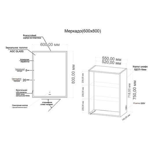 Зеркало-шкаф Меркадо 60 изготовлено из зеркального полотна толщиной 4 мм производства AGC - ведущего европейского производителя. Корпус шкафа выполнен из влагостойкого ЛДСП-16 мм. Корпус зеркала изготовлен из пластика. Шкаф оснащен двумя стеклянными полками, глубиной 10 см. Управление подсветкой осуществляется сенсорным выключателем, расположенным по центру на зеркале. Открывание слева направо.