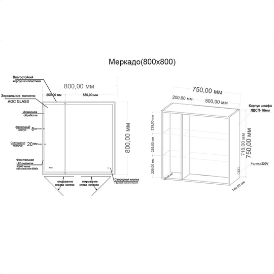 Зеркало-шкаф Меркадо 80 изготовлено из зеркального полотна толщиной 4 мм производства AGC - ведущего европейского производителя. Корпус шкафа выполнен из влагостойкого ЛДСП-16 мм. Корпус зеркала изготовлен из пластика. Шкаф оснащен стеклянными полками, глубиной 10 см. Управление подсветкой осуществляется сенсорным выключателем, расположенным справа на зеркале.