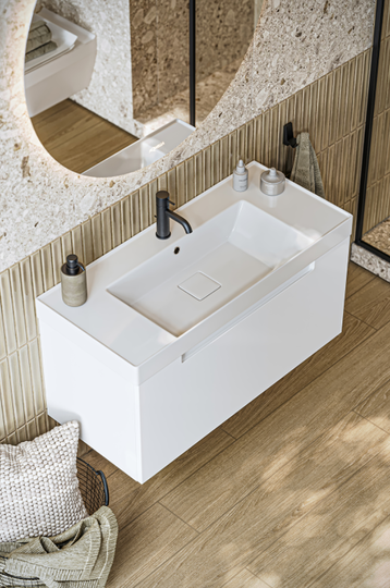 Подвесная тумба Ванкувер 101 оснащена одним ящиком с механизмом мягкого закрывания и тщательно организованным внутренним пространством с отделкой под дерево. Лаконичный фасад крашеный в белый цвет с интегрированной ручкой-зацепом подчеркивают чистоту форм и делают использование особенно удобным. Мебельный умывальник с декоративной вкладкой подчеркивает современный характер коллекции, а оптимальная глубина чаши обеспечивает комфортное ежедневное использование.