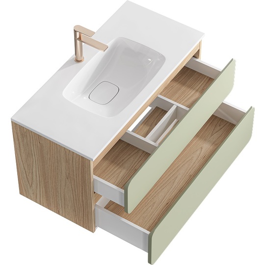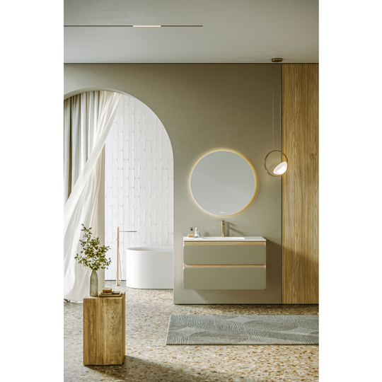 Созданная в стиле софт-минимализма, коллекция Vento отличается мягкой геометрией и визуальной тишиной. Скругленные фасады окрашены матовой краской, также они выполняют функцию скрытых ручек. Древесный корпус из ЛДСП в оттенке светлой акации. Тумбы Vento оснащены умывальниками Malaga из литьевого мрамора, сочетающими четкую геометрию с мягкой пластикой линий. Глубокая практичная чаша обеспечивает комфортность в использовании, а декоративная заглушка в сливной зоне сохраняет чистоту поверхности и архитектурную строгость. Внутреннее пространство продумано до мелочей: дно ящиков выполнено в цвет корпуса, а в верхний ящик установлена система организации внутреннего пространства в виде трех перегородок из ЛДСП.