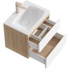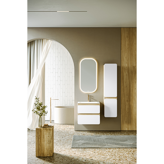 Созданная в стиле софт-минимализма, коллекция Vento отличается мягкой геометрией и визуальной тишиной. Скругленные фасады окрашены матовой краской, также они выполняют функцию скрытых ручек. Древесный корпус из ЛДСП в оттенке светлой акации. Тумбы Vento оснащены умывальниками Malaga из литьевого мрамора, сочетающими четкую геометрию с мягкой пластикой линий. Глубокая практичная чаша обеспечивает комфортность в использовании, а декоративная заглушка в сливной зоне сохраняет чистоту поверхности и архитектурную строгость. Внутреннее пространство продумано до мелочей: дно ящиков выполнено в цвет корпуса, а в верхний ящик установлена система организации внутреннего пространства в виде трех перегородок из ЛДСП.