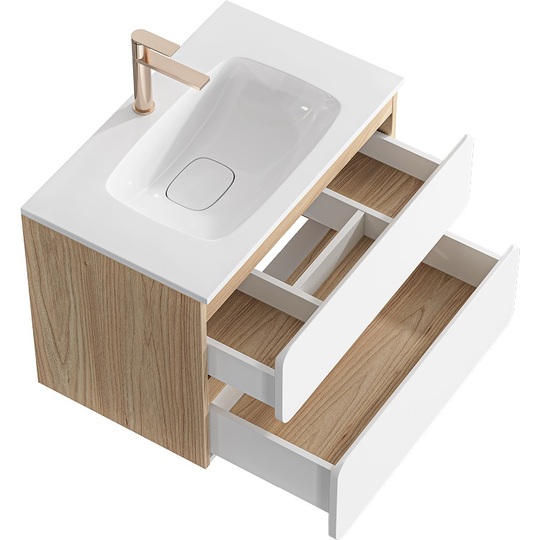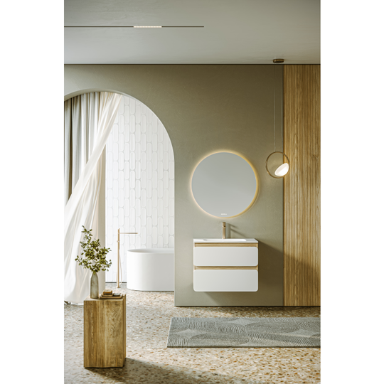 Созданная в стиле софт-минимализма, коллекция Vento отличается мягкой геометрией и визуальной тишиной. Скругленные фасады окрашены матовой краской, также они выполняют функцию скрытых ручек. Древесный корпус из ЛДСП в оттенке светлой акации. Тумбы Vento оснащены умывальниками Malaga из литьевого мрамора, сочетающими четкую геометрию с мягкой пластикой линий. Глубокая практичная чаша обеспечивает комфортность в использовании, а декоративная заглушка в сливной зоне сохраняет чистоту поверхности и архитектурную строгость. Внутреннее пространство продумано до мелочей: дно ящиков выполнено в цвет корпуса, а в верхний ящик установлена система организации внутреннего пространства в виде трех перегородок из ЛДСП.