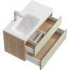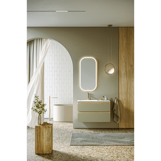 Созданная в стиле софт-минимализма, коллекция Vento отличается мягкой геометрией и визуальной тишиной. Скругленные фасады окрашены матовой краской, также они выполняют функцию скрытых ручек. Древесный корпус из ЛДСП в оттенке светлой акации. Тумбы Vento оснащены умывальниками Malaga из литьевого мрамора, сочетающими четкую геометрию с мягкой пластикой линий. Глубокая практичная чаша обеспечивает комфортность в использовании, а декоративная заглушка в сливной зоне сохраняет чистоту поверхности и архитектурную строгость. Версия тумбы 90 см с асимметричным умывальником, смещенным влево, благодаря чему все необходимое под рукой. Внутреннее пространство тумбы продумано до мелочей: дно ящиков выполнено в цвет корпуса, а в верхний ящик установлена система организации внутреннего пространства в виде трех перегородок из ЛДСП.