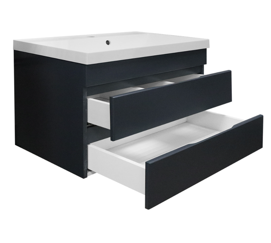 Тумба Эстима 80/2 оснащена двумя выдвижными ящиками на доводчиках скрытого монтажа. Корпус изготовлен из ЛДСП, фасады МДФ толщиной 16 мм. Корпус и фасады производства Kronospan. Бока и фасады крашеные итальянской эмалью.
