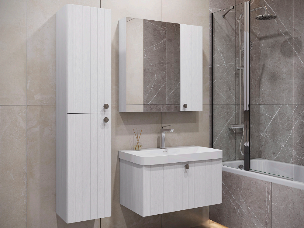 Подвесная тумба с одним широким выдвижным ящиком, оснащенным направляющими Hettich с системой плавного закрывания. Фасад тумбы изготовлен из МДФ, фрезерован вертикальным узором и и облицован пленкой имитирующей текстуру дерева ясень беленый. Внутренние детали из влагостойкого ЛДСП. Ручка из цинкового сплава в цвете состаренный черненый. Тумба подготовлена для подключения водоснабжения снизу и сзади.