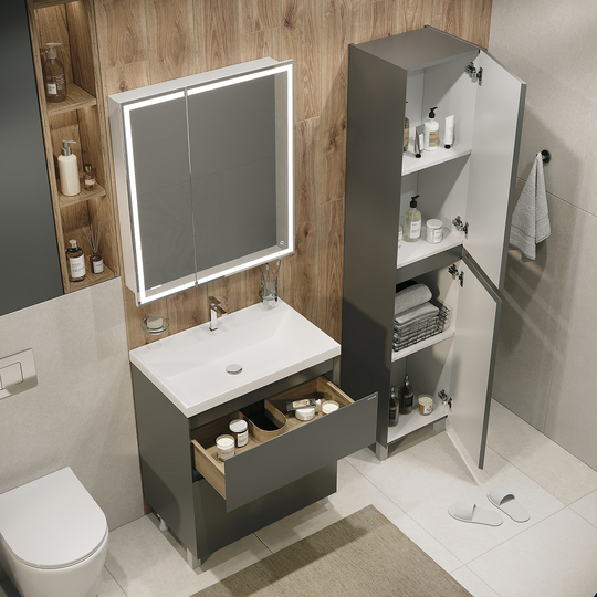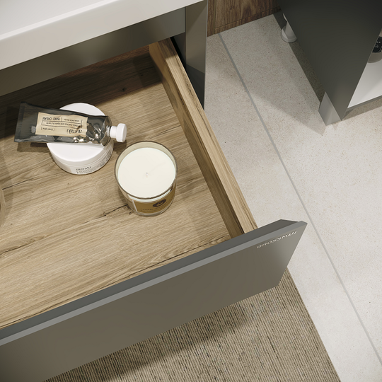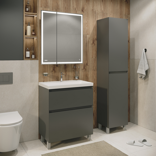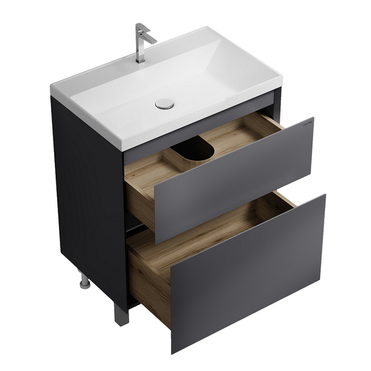 Тумба Меркадо 70 - стильное и функциональное решение для интерьеров в скандинавском и современном стиле. Корпус и фасады выполнены из МДФ в графитовой матовой краске. Фасады с точным запилом под 45° на торцах, что исключает видимую кромку и позволяет обходиться без ручек, создавая лаконичный и минималистичный дизайн. Два вместительных ящика изготовлены из ЛДСП «Дуб Эльвезия» и оснащены направляющими скрытого монтажа с доводчиком, обеспечивающими плавное и бесшумное закрывание. Тумба установлена на хромированные ножки высотой 10 см, а для надежного крепления предусмотрены подвесы в комплекте.