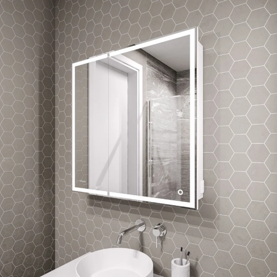 Зеркало-шкаф Меркадо 70 изготовлено из зеркального полотна толщиной 4 мм производства AGC - ведущего европейского производителя. Корпус шкафа выполнен из влагостойкого ЛДСП-16 мм. Корпус зеркала изготовлен из пластика. Шкаф оснащен стеклянными полками, глубиной 10 см. Управление подсветкой осуществляется сенсорным выключателем, расположенным справа на зеркале.